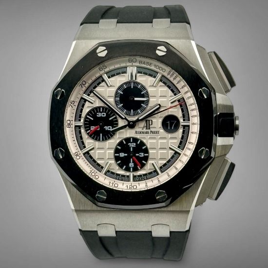 Description: This AP 26400SO Royal Oak Offshore men’s chronograph watch has a 44mm stainless steel case with black ceramic bezel. This version has a white/silver-toned “Méga Tapisserie” dial. It runs on the Calibre 3126 automatic self-winding movement with a 50-hour power reserve.